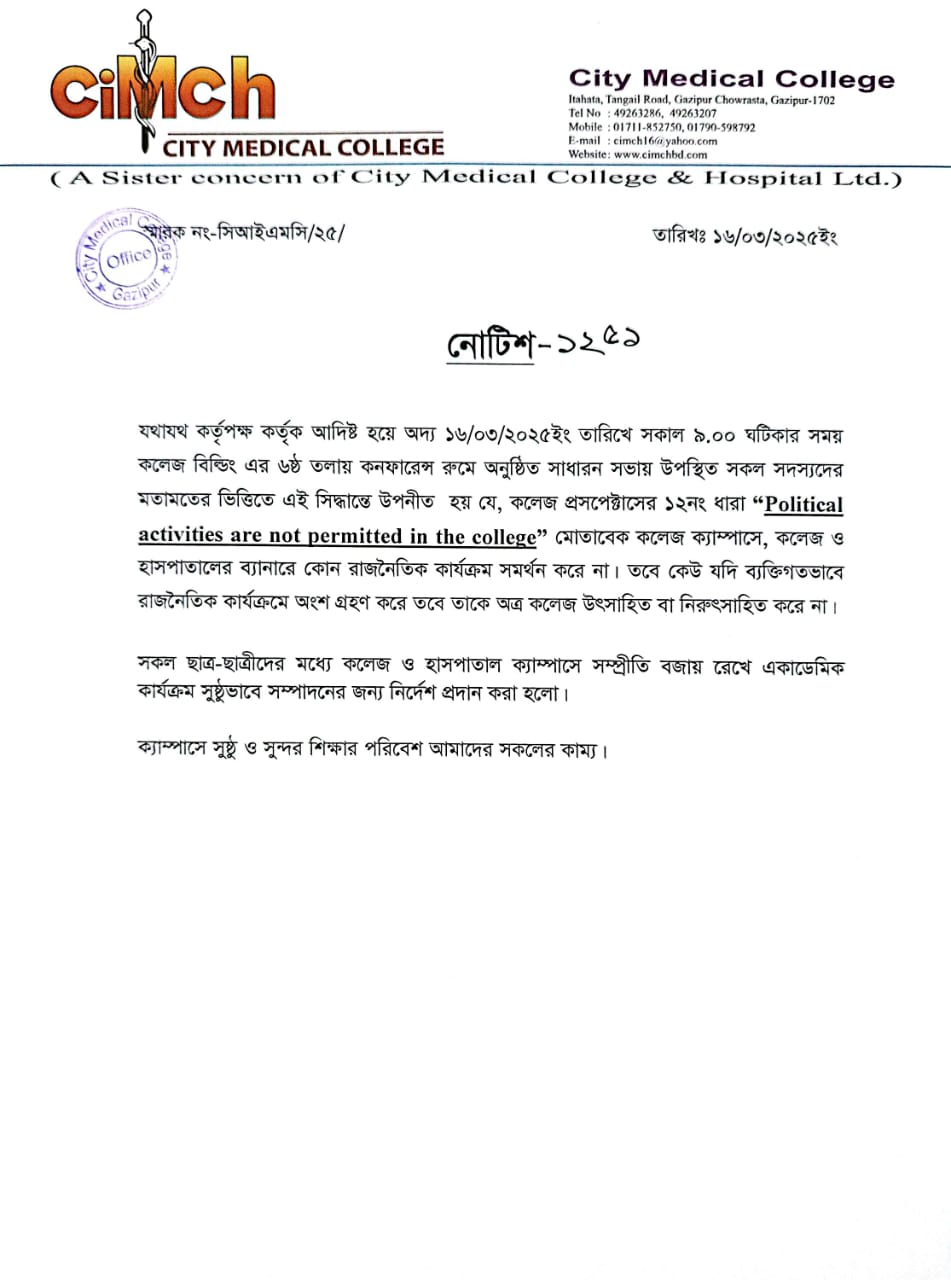 City Medical College offers 5 years MBBS course approved by Ministry of Health & Family Welfare, Govt. of Bangladesh. Affiliated by University of Dhaka, recognized by Bangladesh Medical & Dental Council (BMDC).